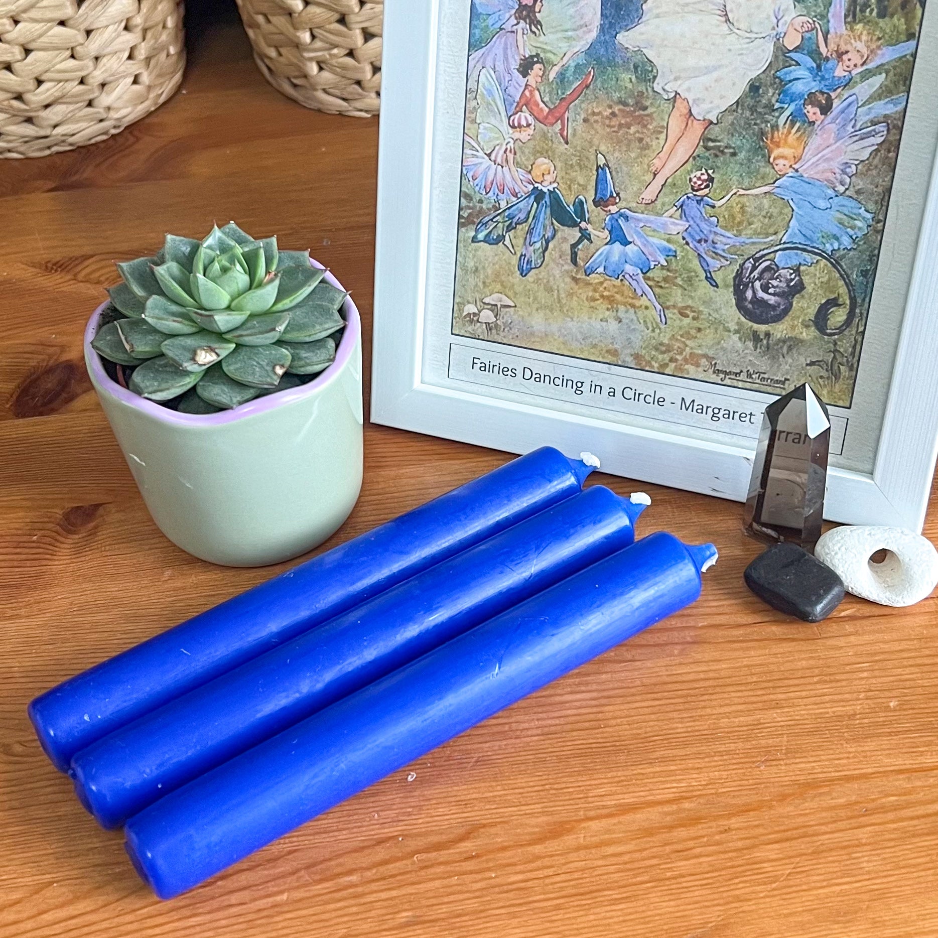 3 dipped blue dinner candles. Blue candles can be used in spell work to encourage communication and inspire peace and tranquillity.