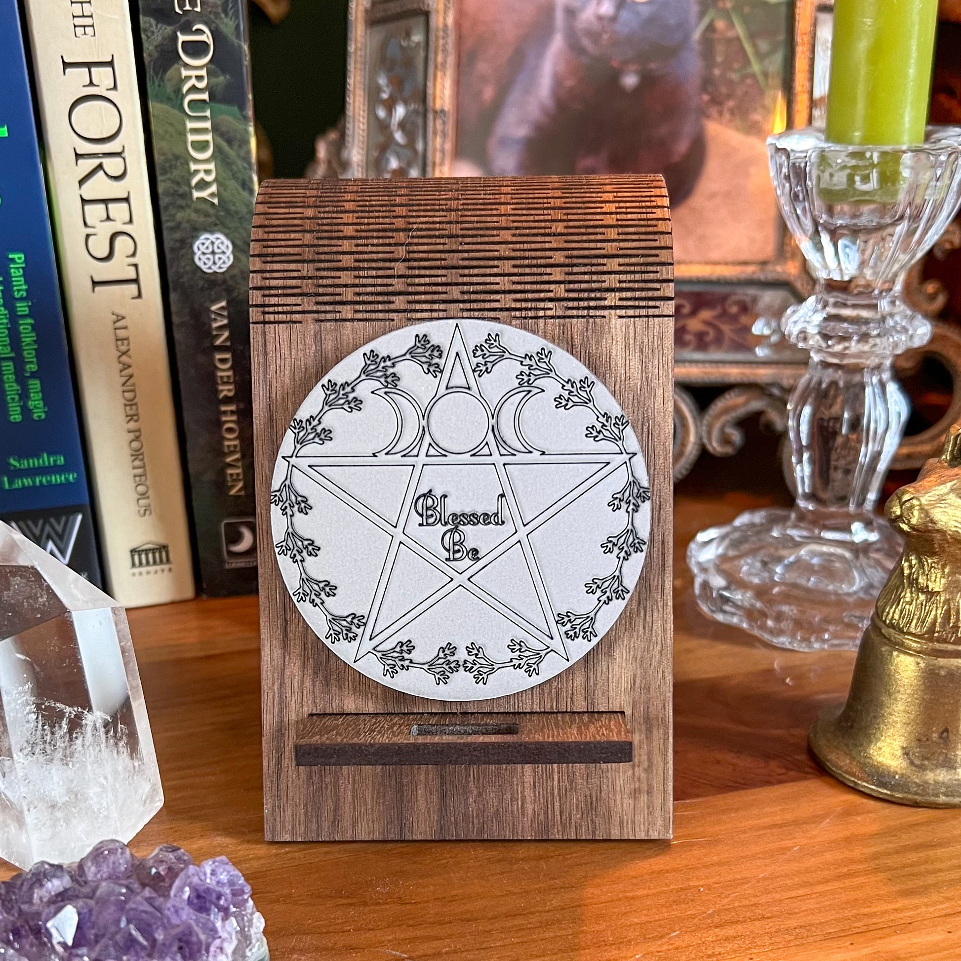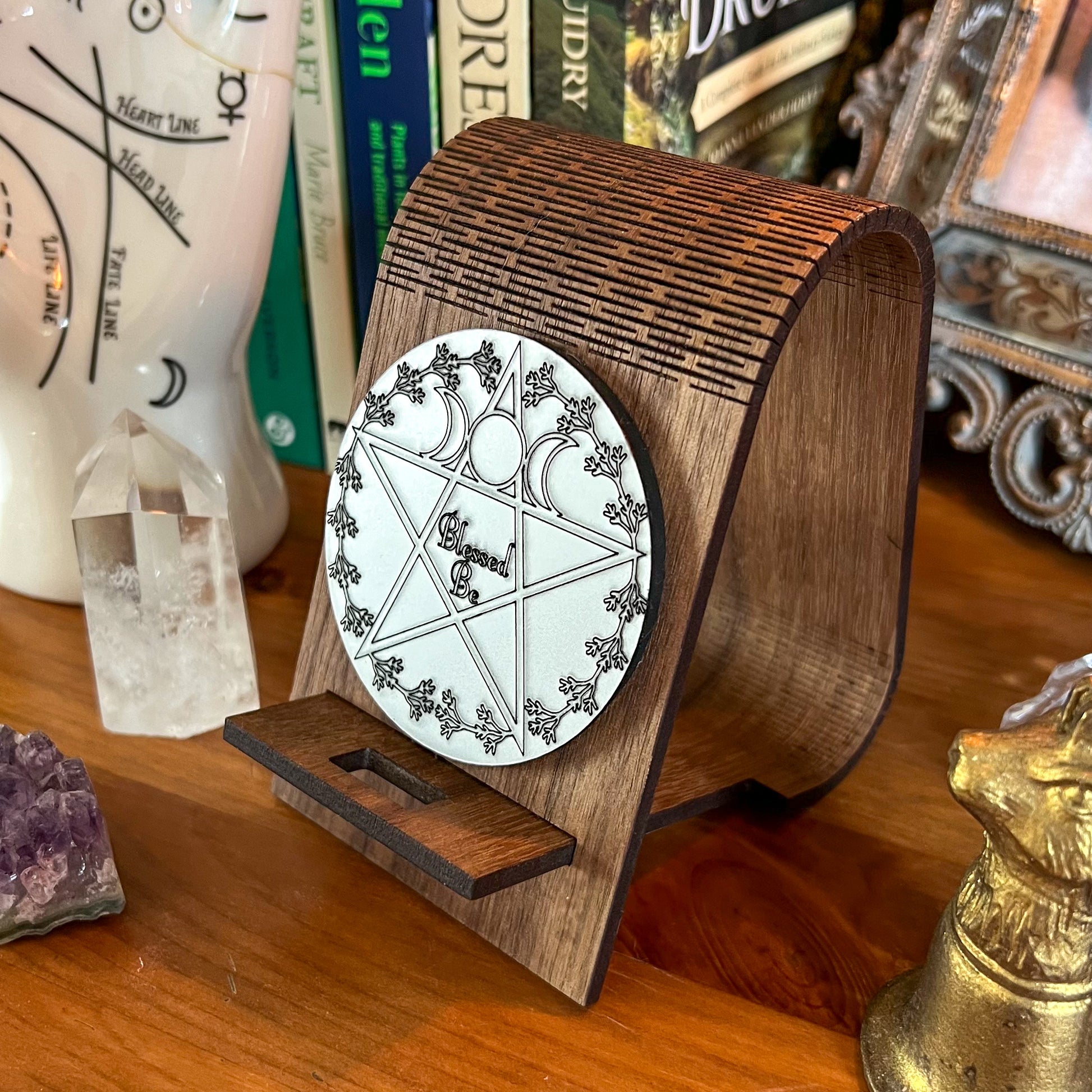 Handmade and finished mobile phone stand with pentagram. Made from AB grade American black walnut.